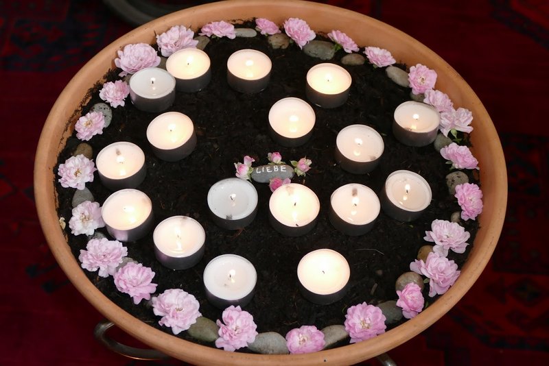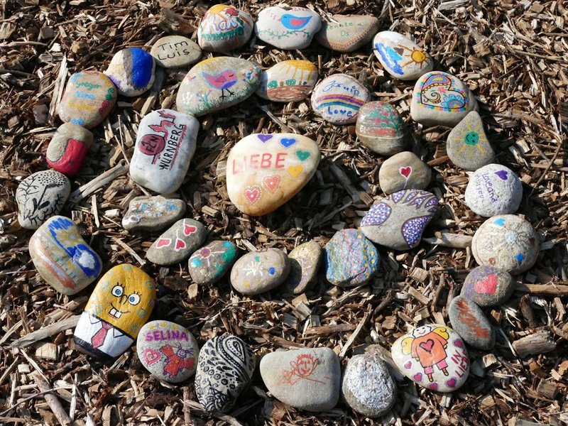 Selbst bemalte Kieselsteine in der Mitte unseres Labyrinthes