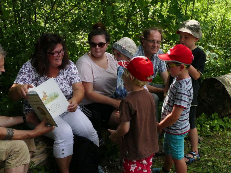 Christine Eibert erzählt den Kindern die Geschichte vom kleinen Hasen: „Weißt du, wie lieb ich dich hab“